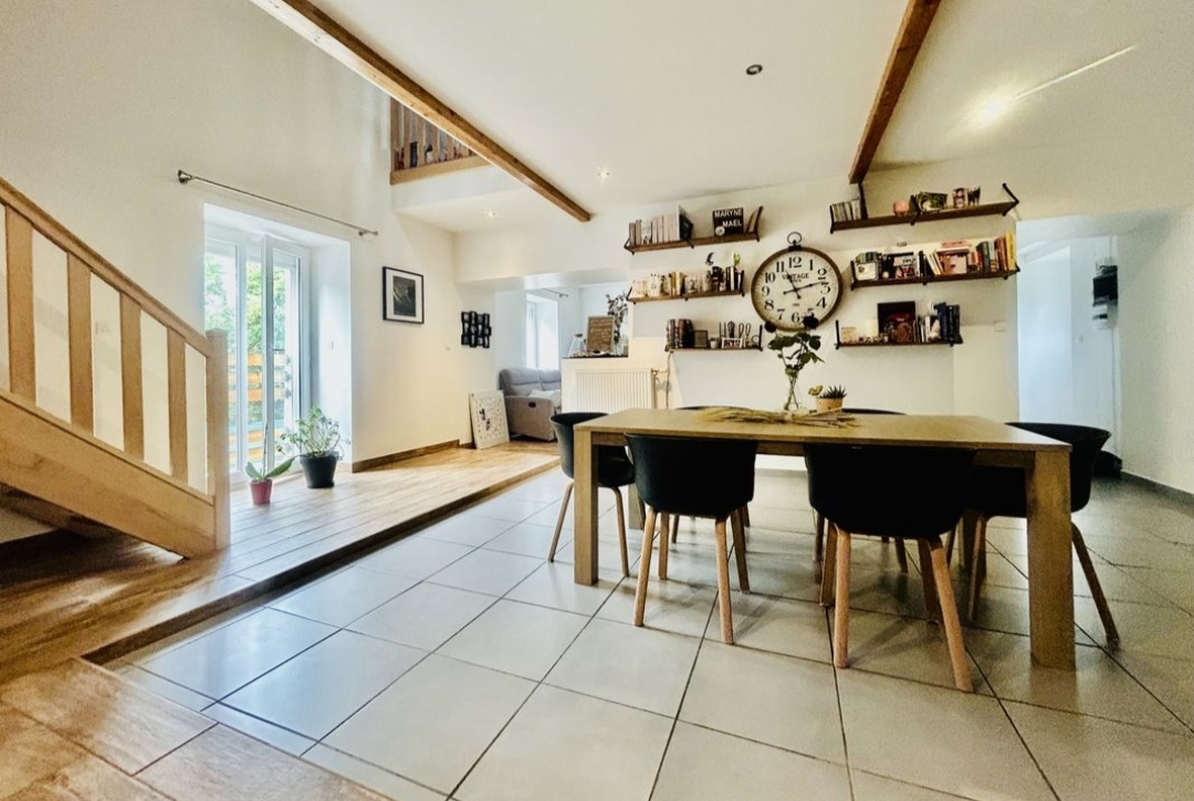 – Une spacieuse pièce de vie lumineuse avec poutres apparentes et cuisine ouverte entièrement équipée, donnant sur la salle à manger.
