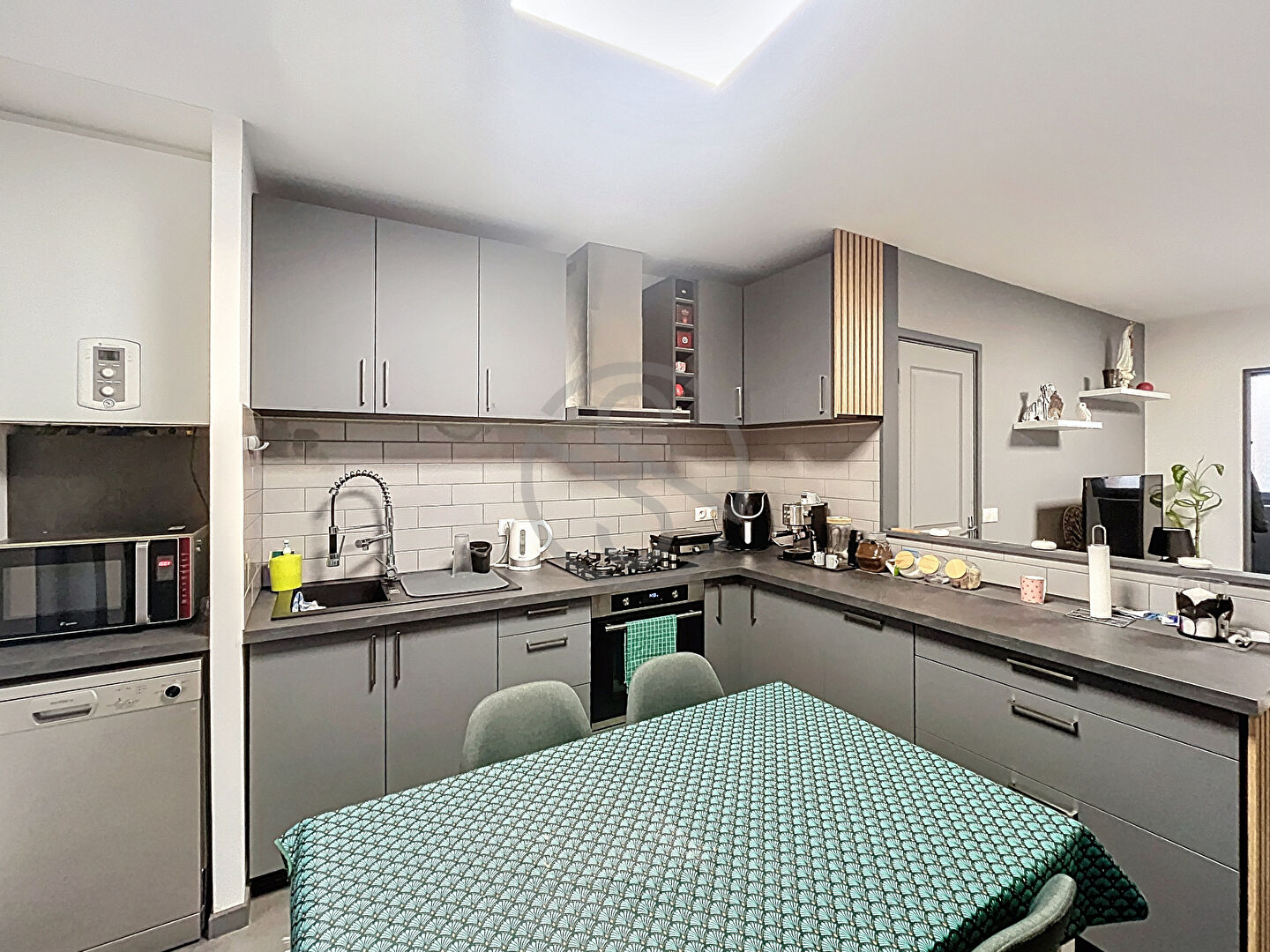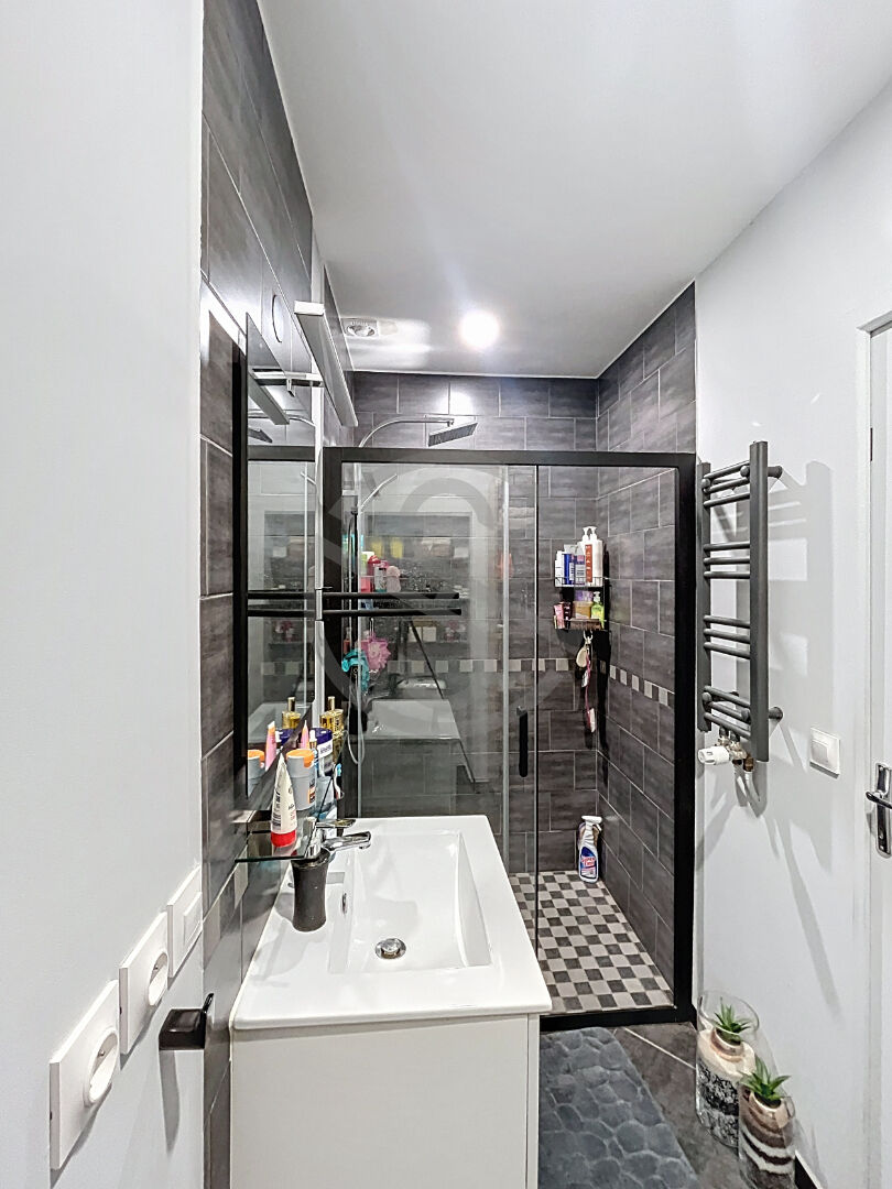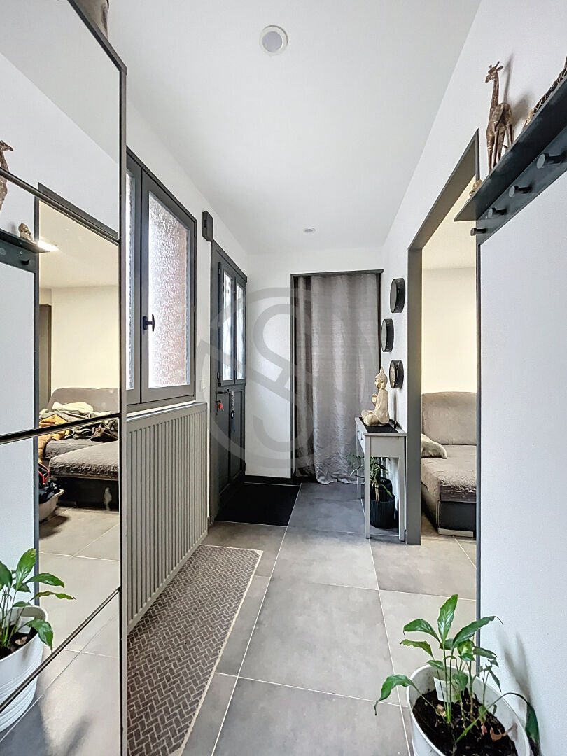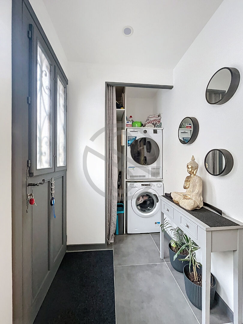 Ce bien de 59,1 m² loi Carrez comprend au rez-de-chaussée : un grand hall d’entrée, un espace buanderie, un séjour ouvert sur une cuisine américaine équipée de fin 2022, un WC séparé avec un lave-main.