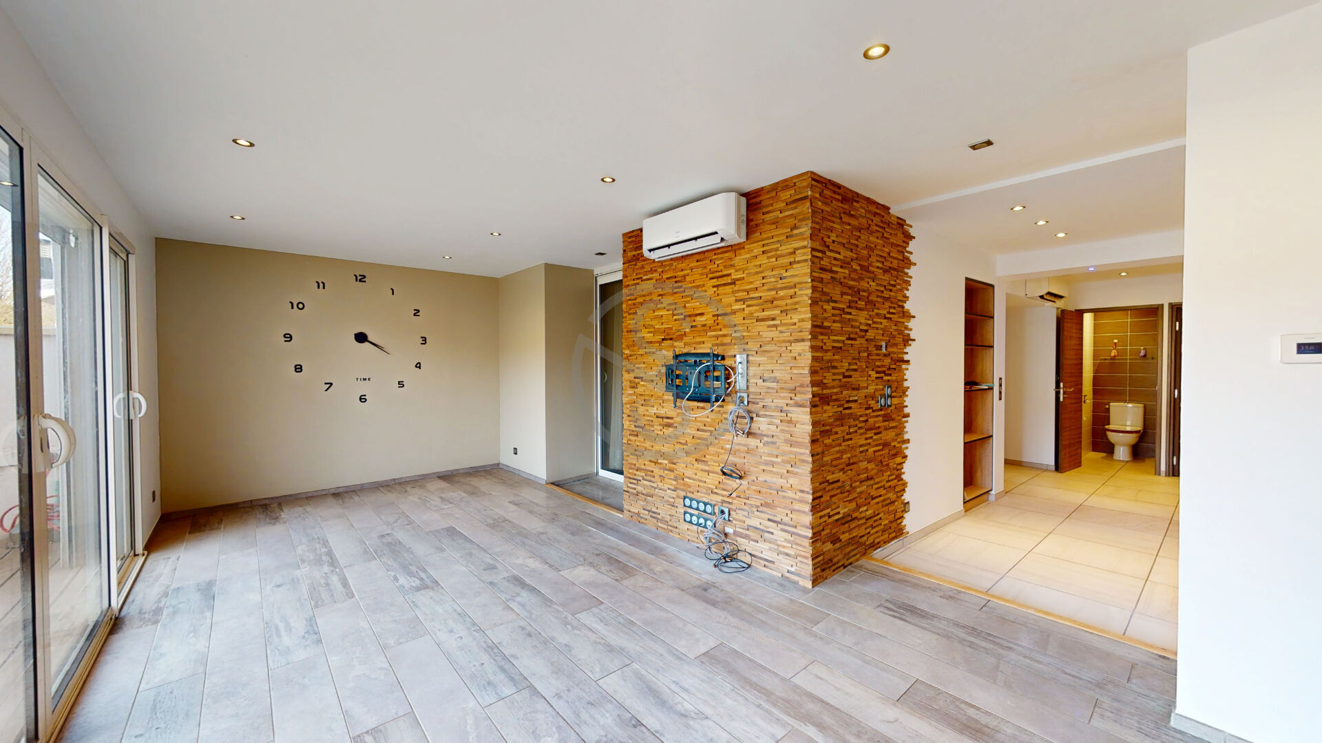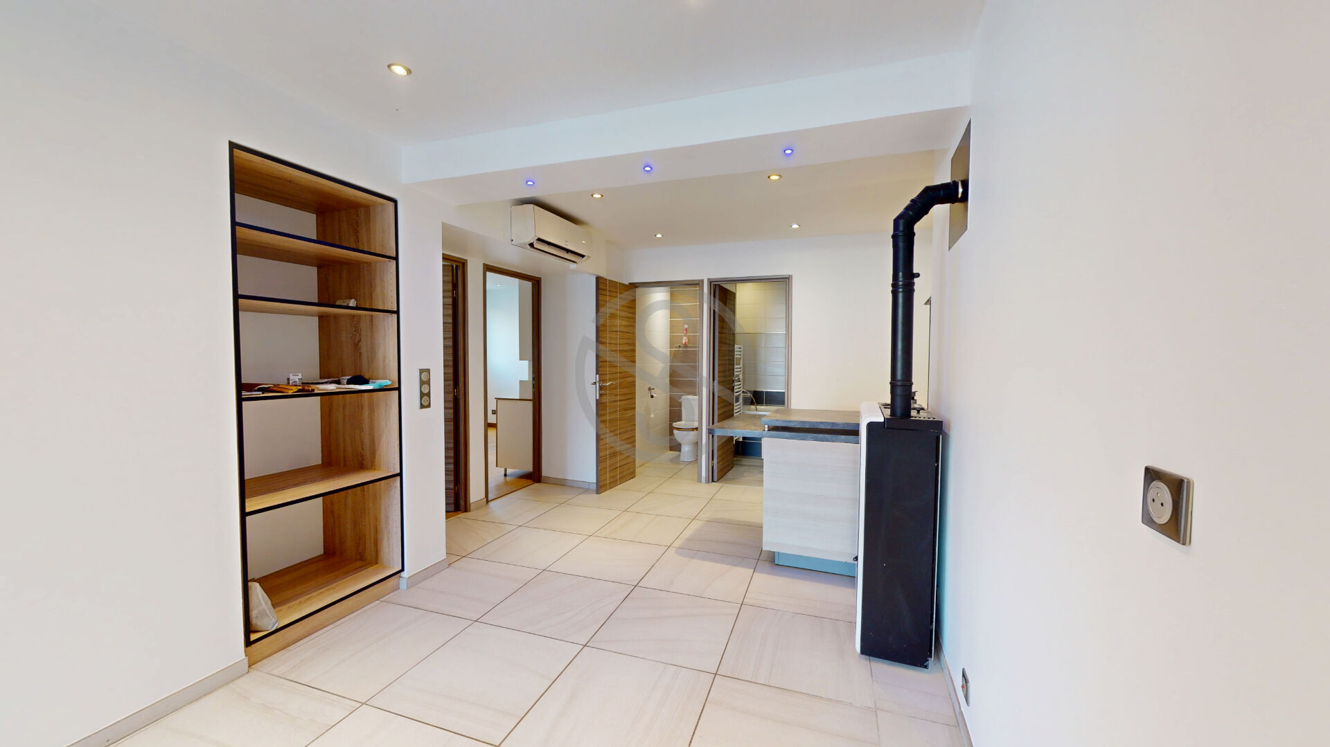 Il se compose d’une entrée, d’une cuisine équipée et aménagée, ouverte sur une salle à manger, le tout pour 26m², ainsi qu’un salon de 21m².
