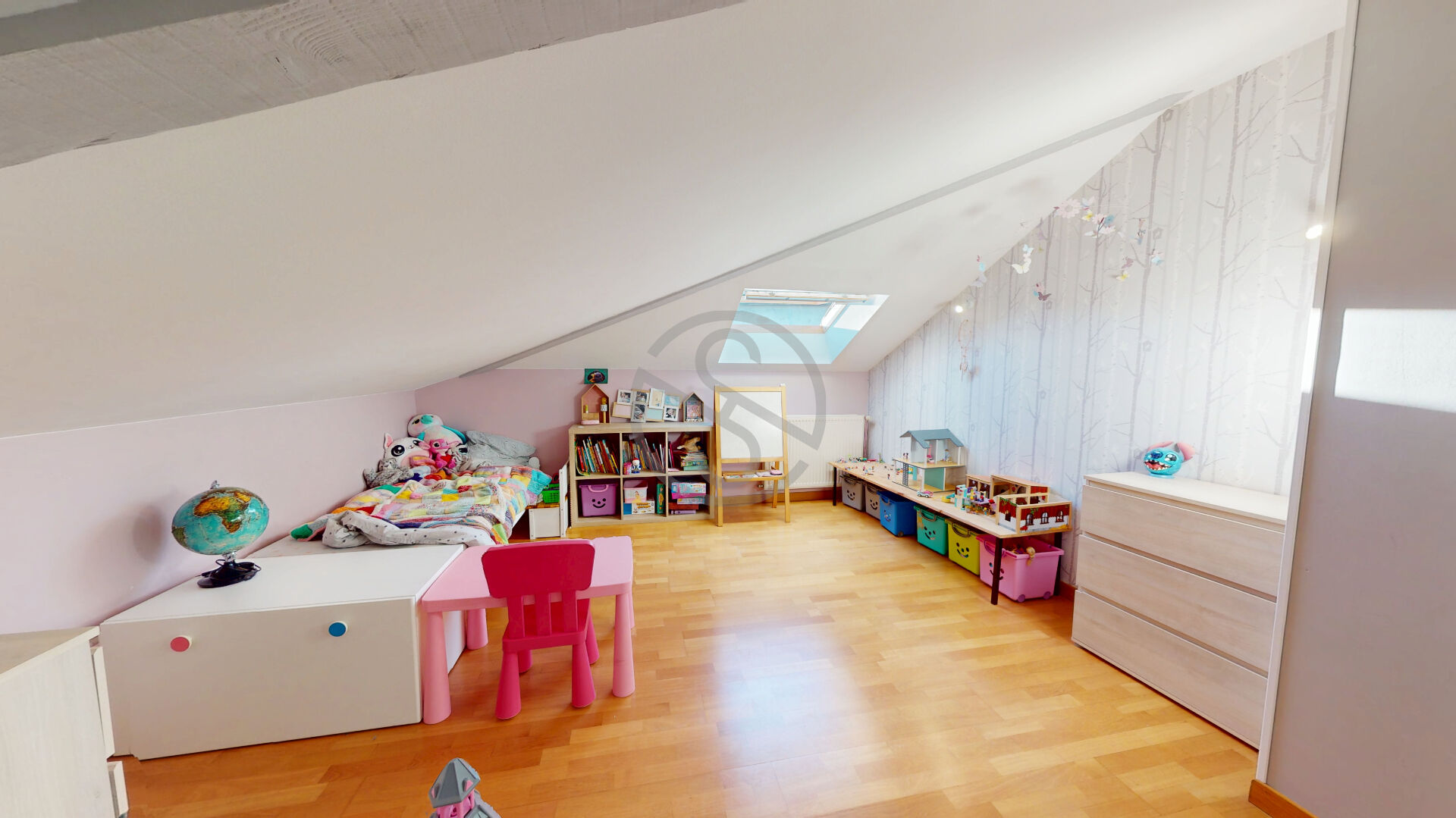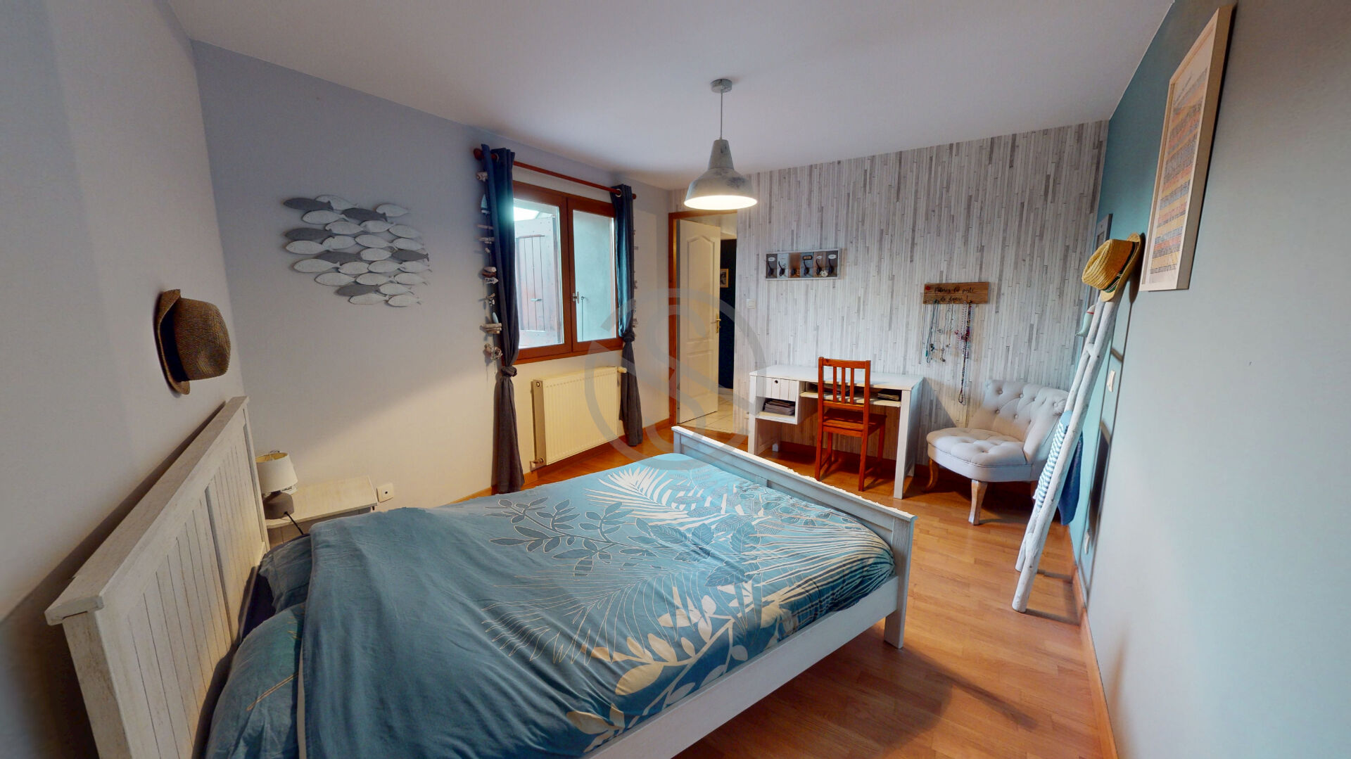A l’étage 3 grandes chambres (de 19, 20 et 14 m2) dont 1 avec dressing, une grande salle de bain avec baignoire + douche et un WC.