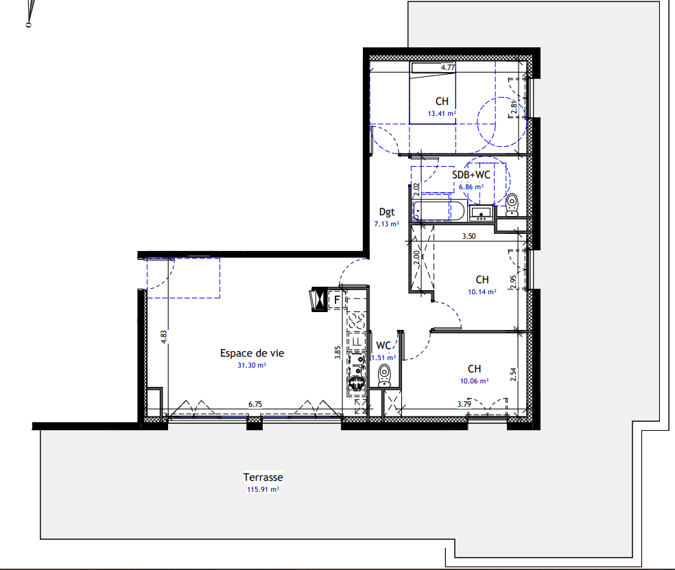 Une pièce de vie de 28.04m² ainsi que deux chambres de 10.20 et 14.09m², une belle salle de bains avec WC.