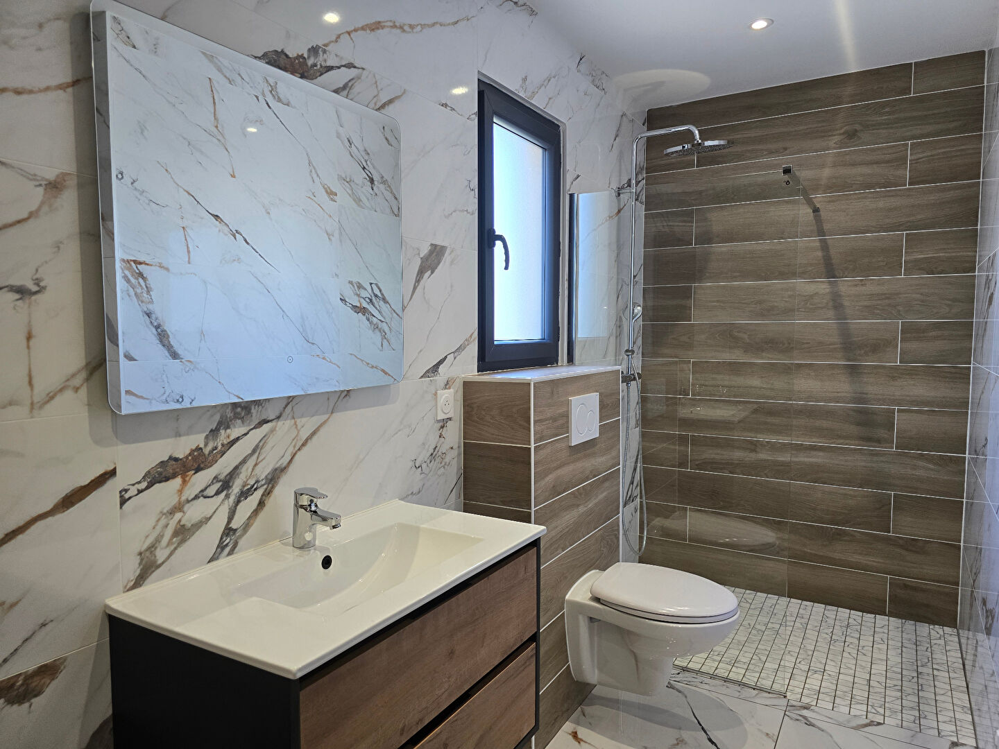 Au 1er étage, 2 chambres de 11 et 21m2 avec dressing. Une salle de bain avec baignoire et douche à l’italienne, toilette, double vasque, miroir lumineux.