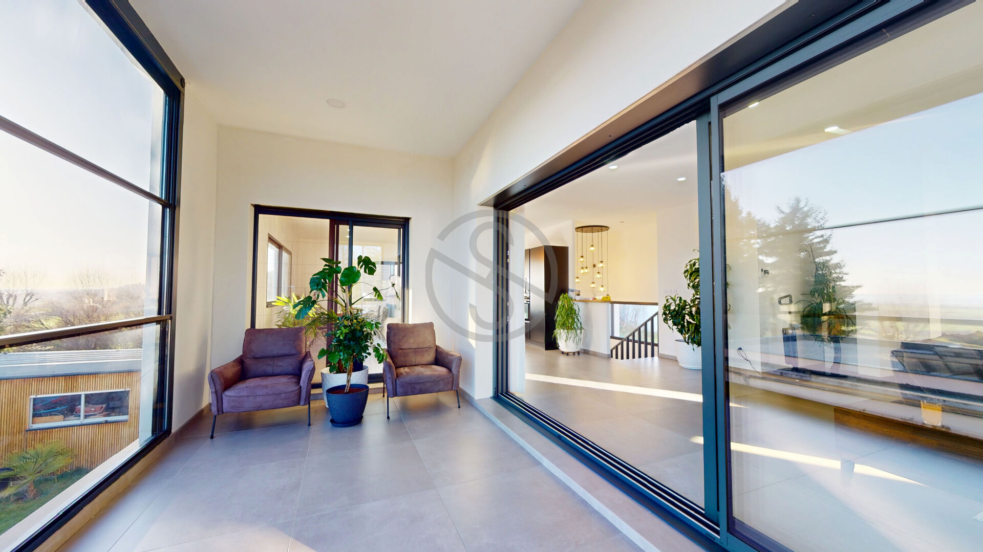 Un confortable et bel escalier vous permet d’accéder au 1 étage.Sur ce niveau, vous découvrez une magnifique pièce de vie , lumineuse tournée vers les montagnes avec son accès piscine et une splendide et surprenante véranda transformable.