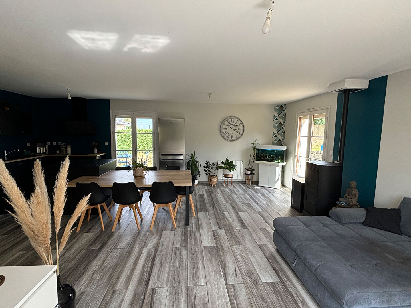 Cuisine ouverte sur un séjour lumineux avec poêle à granulés