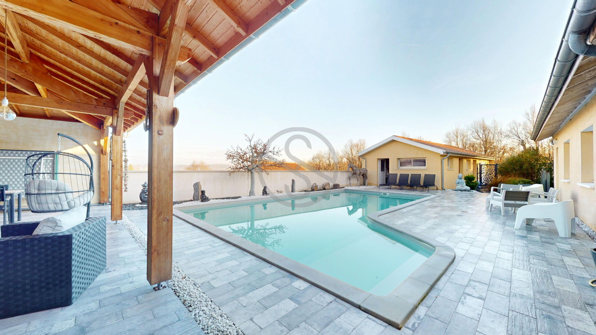 Les extérieurs ont été pensés comme un véritable lieu de vie à part entière avec plusieurs terrasses un four à pizza différents, espaces détente, une piscine enterrée harmonieusement intégrée ainsi que des zones couvertes permettant de profiter de l’extérieur en toute saison